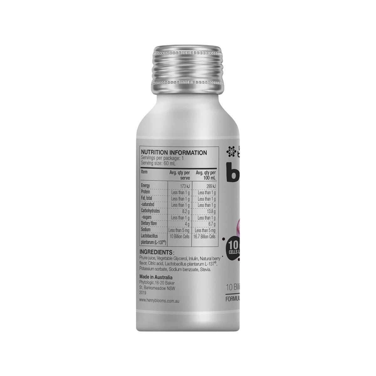 Prune juice, Vegetable Glycerol, Inlulin, Natural berry flavor, Citric acid, Lactobacillus plantarum L-137®, Potassium sorbate, Sodium benzoate, Stevia.